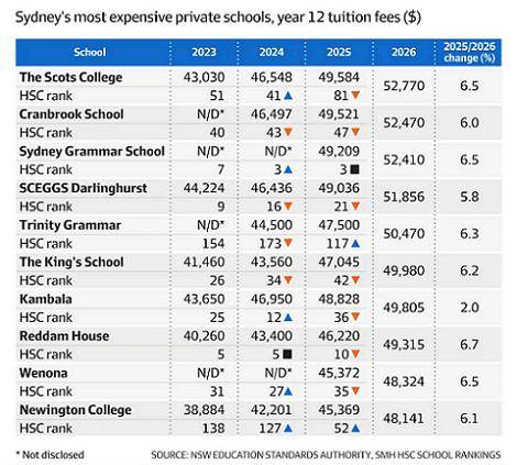 据《澳金融评论报》,The Scots College苏格兰公学仍是新州最昂贵的私立学校,2026年12年级学费为52,770澳元,比上一年增长6.5%。2025年该校的HSC学校排名创下过去十年最令人失望的记录,下降40位,排名第81。