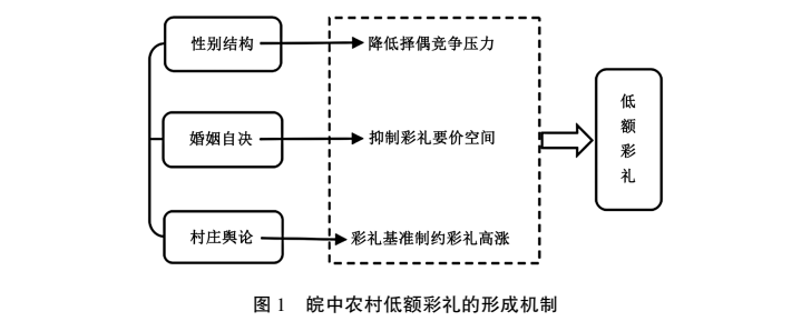 当下低额彩礼的形成机制引发了学界关注。其一,代际关系视角认为代际关系样态是农村低额彩礼的重要成因。彩礼支付以一种准制度化的方式实现了财富在家庭内部的代际转移。其中,在子女已经“努力干活,给自己家作了大量贡献”的情况下,有的子女会觉得获取彩礼和嫁妆“像是从家里拿走自己存款”。然而,“联合家庭再生产模式”是抑制宗族性村庄女儿成为彩礼要价主体的一个重要因素。宗族性村庄的联合家庭再生产模式以父权制为代际关系的核心,代际关系呈现出“强代际伦理、弱代际支持”的特点,加之子代的资本积累有限,降低了高额彩礼的可能性。这种“强代际伦理、弱代际支持”的代际关系样态构成农村低额彩礼的重要成因。其二,人口流动视角认为女性资源的流入是出现低额彩礼的重要原因。在人口流动背景下,农村适婚女性的跨区域流动造成农村地区女性资源流失,引发农村地区婚姻资源的结构性失衡以及对农村适婚男性的“婚姻挤压”。在“婚姻挤压”之下,当地男性面临“结婚难”问题。女性在婚姻“市场”中逐渐占据主导地位,其“婚姻市场要价”能力得到增强,因而拉高了彩礼。相对而言,在一些女性人口流入地区,“婚姻圈高地”的梯度效应吸引了大量女性资源流入,当地女性资源相对充足,使得本区域彩礼维持较低水平。就此而言,女性资源的流入是出现低额彩礼的重要致因。其三,情感合意视角认为婚姻当事人的情感合意是形成低额彩礼的重要影响因素。彩礼虽然“兼具支付属性与礼仪属性”,但首先是蕴含一种深厚的礼俗意涵,起到规范“姻亲秩序”的作用。“个体化进程中,个体掌握了婚姻的决策权”,适婚青年当事人成为缔结婚姻的重要决策主体。由此,适婚青年个人的情感合意状况构成了决定彩礼数额的重要因素。“在自由恋爱和性别平等的地方情境中,以情感为核心的亲密关系成为婚姻的决定因素”,彩礼的礼俗面向得以凸显,促进了低额彩礼的形成。就此而言,适婚青年的情感合意状况是形成低额彩礼的重要影响因素。